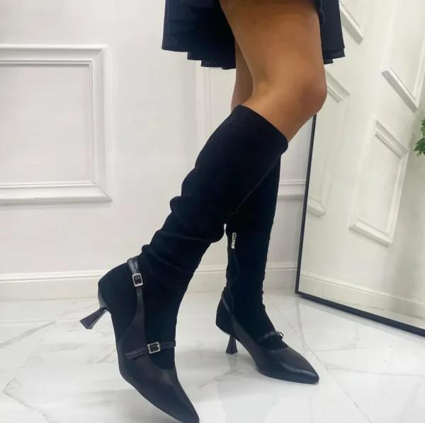 COLORI: NERO Questo stivale alto, è un accessorio davvero unico ed inimitabile nelle sue caratteristiche. Indossato si posa perfettamente sul piede e la gamba della donna che l’utilizza, regalandole comodità e personalità, due caratteristiche che ogni donna ricerca in un accessorio. Le sue peculiarità sono: la punta, il tacco alto 6 cm, altezza gambale 39 cm, il tessuto eco pelle camosciato, la mezza cerniera e hanno una calzata regolare. Possono essere accostati capi come: gonne, shorts, vestitini ed ecc…