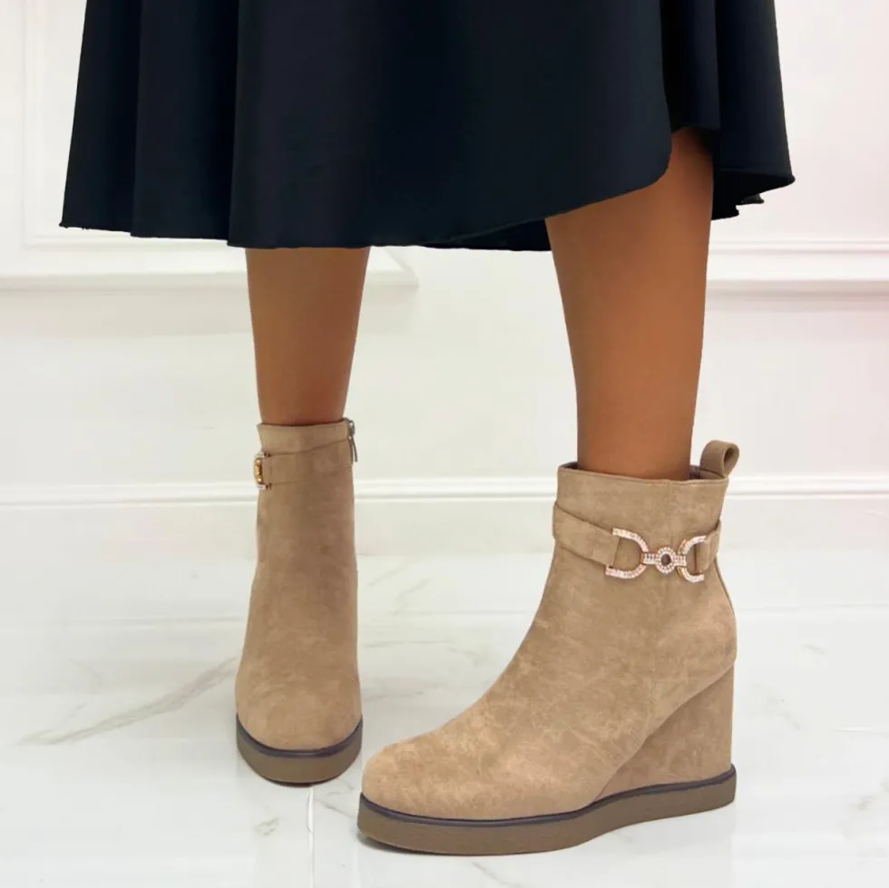 COLORE: BEIGE Questa tronchetto, è un accessorio davvero unico nel suo genere. Indossato accompagna perfettamente il capo della donna che utilizza, regalandole comodità e spensieratezza. La sua particolarità è la zeppa alta 10 cm, altezza gambale 11 cm, punta tonda, la chiusura con cerniera interna , il dettaglio in strass, il tessuto in ecopelle camosciata e hanno una calzata regolare. Può essere adatto per qualsiasi occasione la donna voglia utilizzarlo, sia per una giornata meno impegnativa da passare con i propri amici o per serate più impegnative, come ad esempio una cena.