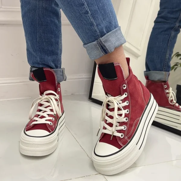 COLORI: BORDEAUX – JEANS- NERAPer affrontare le tue giornate lavorative, o per fronteggiare giornate impegnative, ti proponiamo questa stupenda sneakers. Indossata si posa al piede con comodità, elemento portante che ogni donna ricerca per sentirsi spensierata. Le sue peculiarità sono: la punta tonda, la zeppa alta 4 cm e mezzo, il gambale 11cm ed i lacci . Possono essere affiancati a capi come: jeans, leggings, shorts ed ecc… Hanno una calzata regolare.