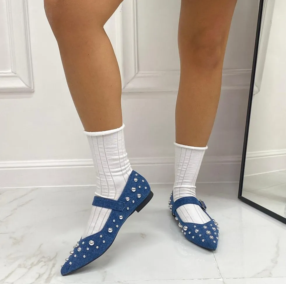 Primi Tacchi Rita – Scarpe Donna Ballerine Cinturino Borchie Casual JEANS Clearance