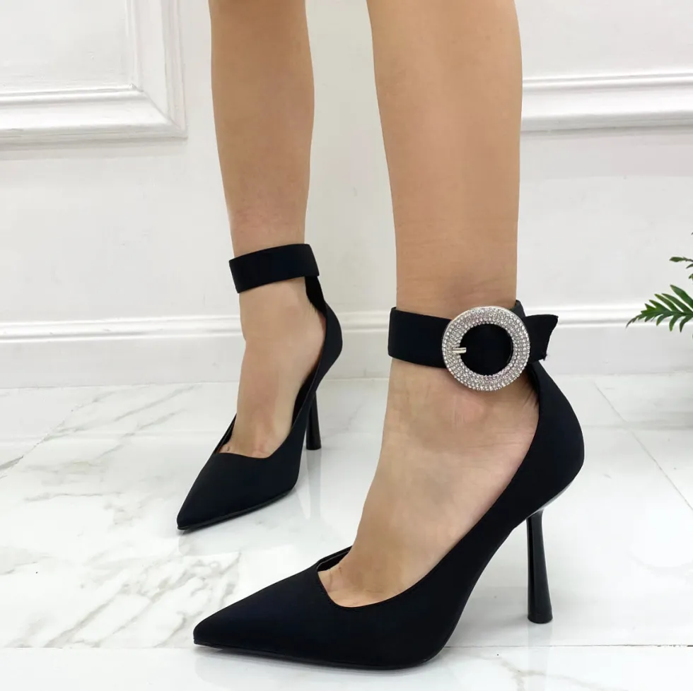 COLORE: NERO Questo classico decolleté è un accessorio davvero elegante ed unico nel suo genere hanno una calzata regolare e l’altezza 10 cm . Indossato, adorna perfettamente l’abito della donna che l’utilizza. Le particolarità di queste scarpe sono: il tacco a spillo, gli strass posti sulla fibbia, che regalano quell’effetto gioiello e la punta, che rendono il piede bellissimo e la donna che le indossa davvero unica. Può essere adatto in circostanze eleganti, come cerimonie, party, feste, serate danzanti o cene in dolce compagnia.