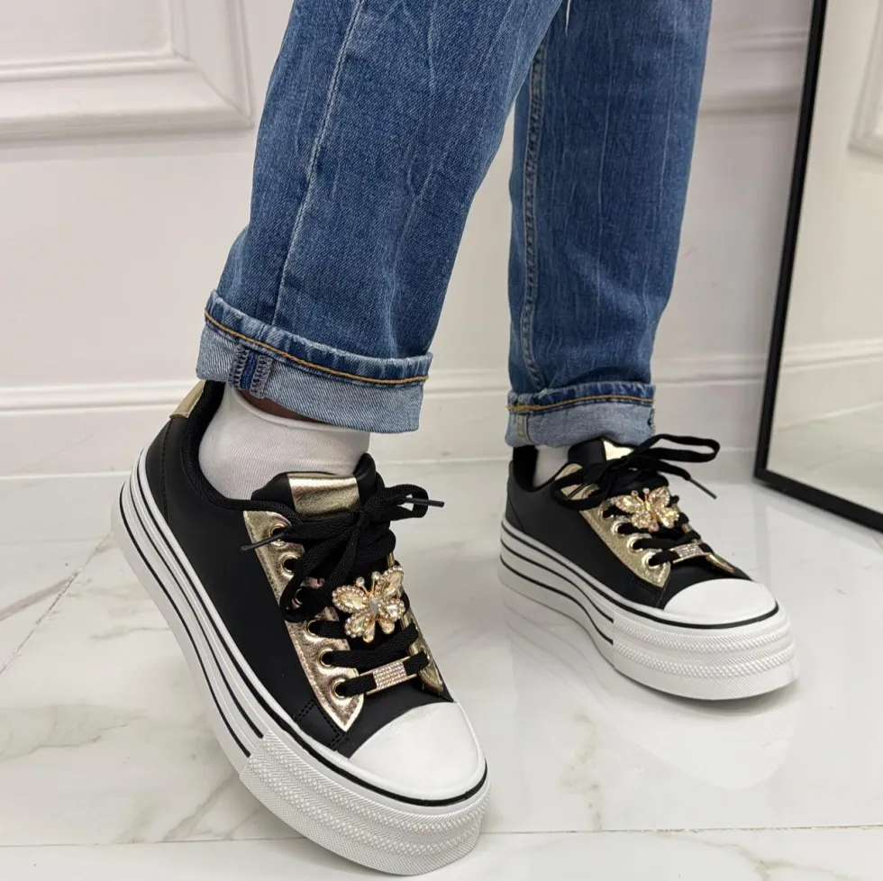 COLORI: NERA – LEOPARDATA – JEANSPer affrontare le tue giornate lavorative, o per fronteggiare giornate impegnative, ti proponiamo questa stupenda sneakers. Indossata si posa al piede con comodità, elemento portante che ogni donna ricerca per sentirsi spensierata. Le sue peculiarità sono: la punta tonda, la zeppa alta 3 cm e mezzo, farfalla rimovibile ed i lacci . Possono essere affiancati a capi come: jeans, leggings, shorts ed ecc… Hanno una calzata regolare.