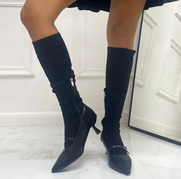 COLORI: NERO Questo stivale alto, è un accessorio davvero unico ed inimitabile nelle sue caratteristiche. Indossato si posa perfettamente sul piede e la gamba della donna che l’utilizza, regalandole comodità e personalità, due caratteristiche che ogni donna ricerca in un accessorio. Le sue peculiarità sono: la punta, il tacco alto 6 cm, altezza gambale 39 cm, il tessuto eco pelle camosciato, la mezza cerniera e hanno una calzata regolare. Possono essere accostati capi come: gonne, shorts, vestitini ed ecc…